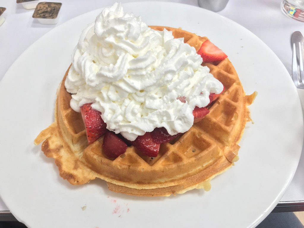 i then walked to the donut villa diner in central square and met up with some friends. i ordered a waffle with strawberries and cream: