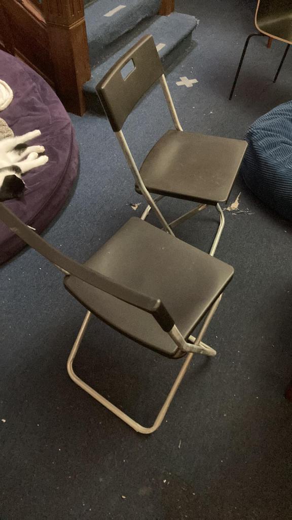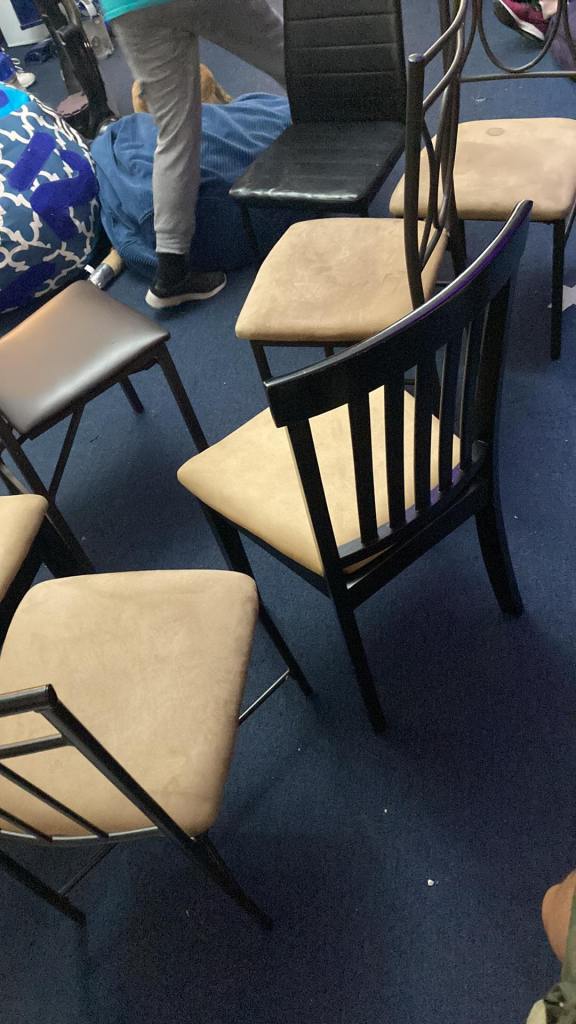 previously, the dining room was filled with falling-apart plastic folding chairs. i received a budget of $10/chair to acquire some more aesthetic seating implements. conveniently, leasing contracts in boston were just about to expire so many renters were moving out. i set out on facebook marketplace and craigslist to snatch up their unwanted chairs.